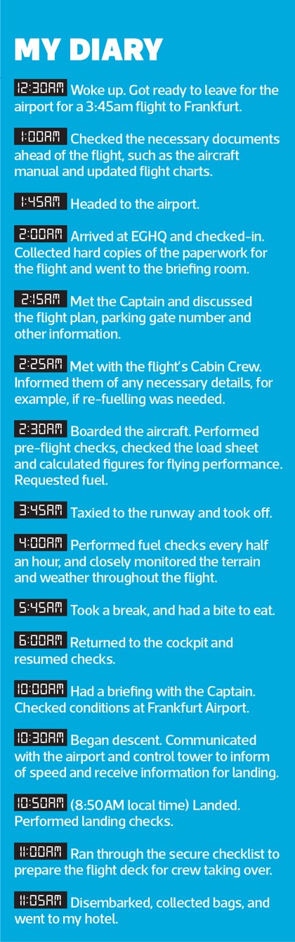 As a First Officer, I make sure the flight is prepared for take-off. I run checks to ensure the navigation, safety and operation systems are working properly. When the Captain is flying, I monitor take-off and landing to ensure the safety and comfort of all our customers. I also carry out fuel checks and regularly monitor the climate and route so that we’re prepared in case of turbulence or emergencies.