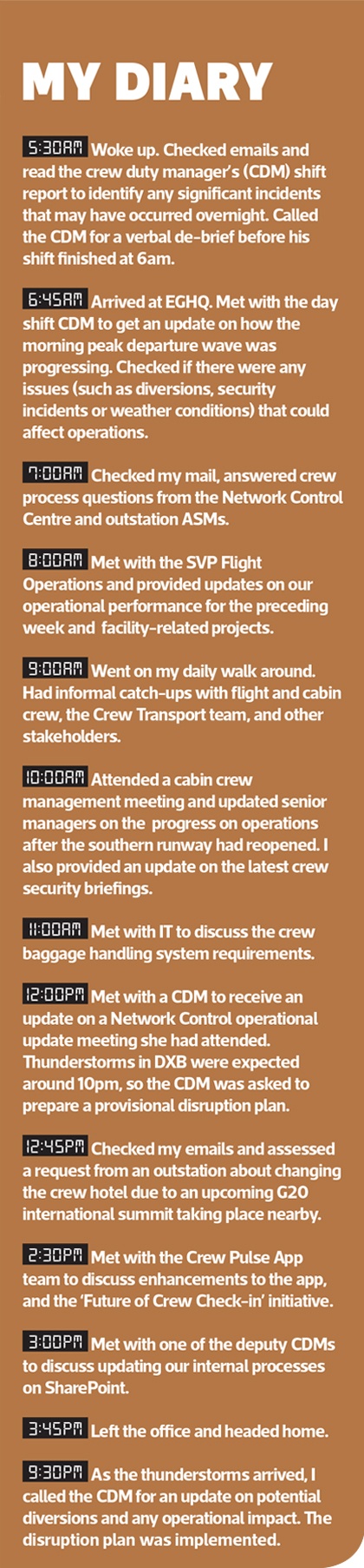 My key responsibilities are leading, directing and overseeing the ‘Emirates Group HQ Crew Airport’, which facilitates 3.7 million flight and cabin crew movements per year and the handling of 1.3 million suitcases. It’s not widely known that the scale of our crew operation in the headquarters is greater than that of Aberdeen airport, which is rated as the UK’s 16th busiest airport.