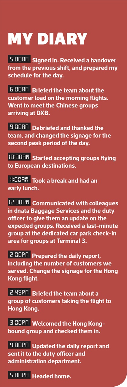 I work closely with the Invitation Only/VIP Services team that meets and greets Chinese VIPs, assisting them at DXB. Besides this, I also assist Chinese tourist groups at Arrivals and Departures. I communicate regularly with 18 local Chinese travel agencies as part of this process. I meet Chinese groups every day, and they’re very happy to see a Chinese person working for Emirates. It makes them feel welcome and special.